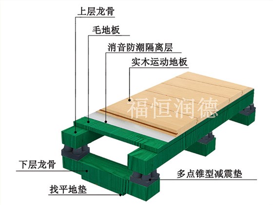 主辅龙骨专业型:结构标高100mm,完全满足运动木地板的保护功能、运动功能、技术功能,此结构适用于各类教学训练、表演等,主要适用于中小学、企事业单位训练馆,如篮球场、羽毛球场、排球场等中高端体育场馆使用。